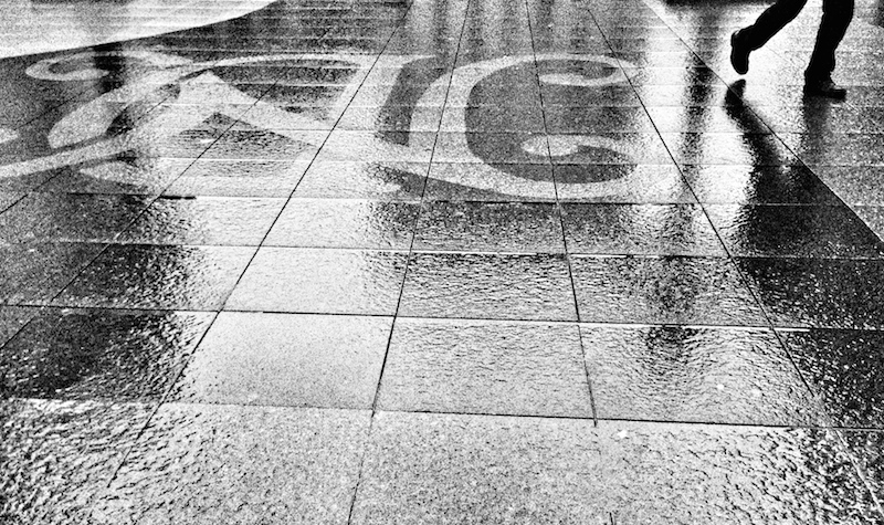 on the move Published May 9, 2014 at 800 × 475 in Weekly Photo Challenge: On the Move man running across wet flagstones